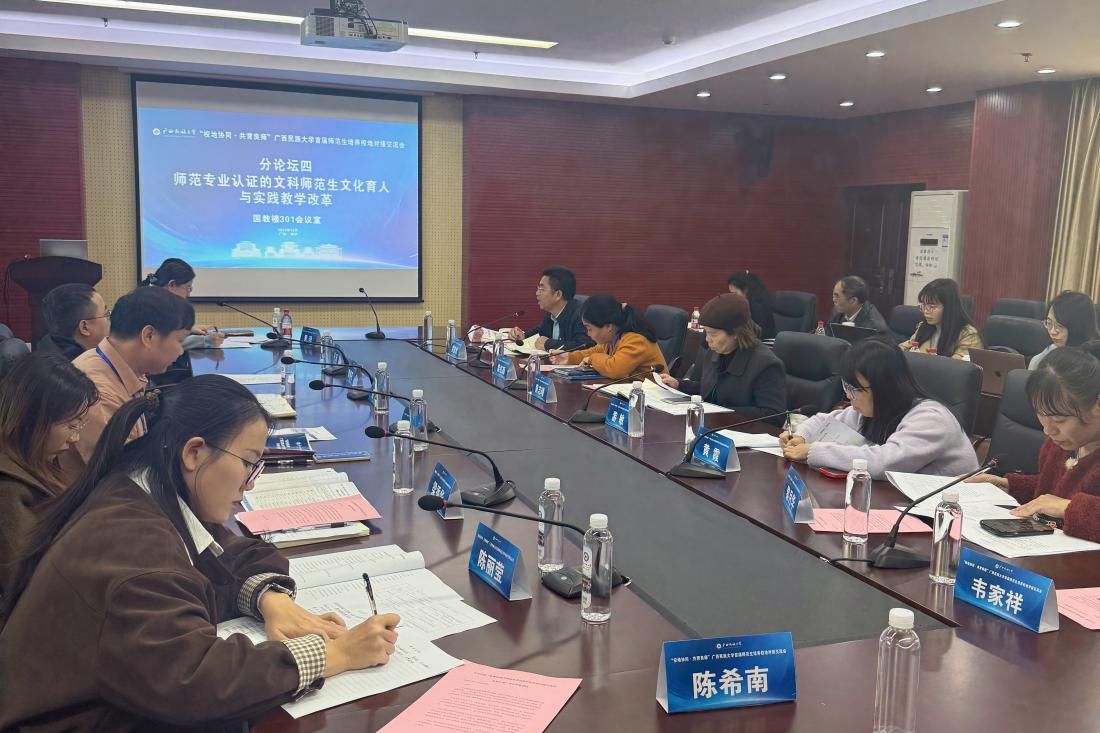 12月28日下午,交流会6个分论坛同步开展。在国际教育综合楼301举行的“师范专业认证的文科师范生文化育人与实践教学改革”分论坛上,学院副院长潘艳红、英语系主任张跃军、副主任高琳,以及朱文宣、王依宁、杨诚等教师代表应邀出席,围绕师范专业人才培养模式、校地协同育人机制等议题,与与会专家展开深度交流研讨。南宁外国语学校副校长黄春花,南宁市第四中学副校长黄家财,横州市高级中学副校长黎红颜,南宁市高新二路中学校长罗起欢,以及扶绥县第三中学副校长黄志璠等,分别围绕“大思政课”创新育人模式建构、“双新”背景下的课堂改革、师范生培养的核心需求与协同路径、中学班主任工作实践方略、校地协同开展三习实践等主题进行了深入研讨与经验分享。