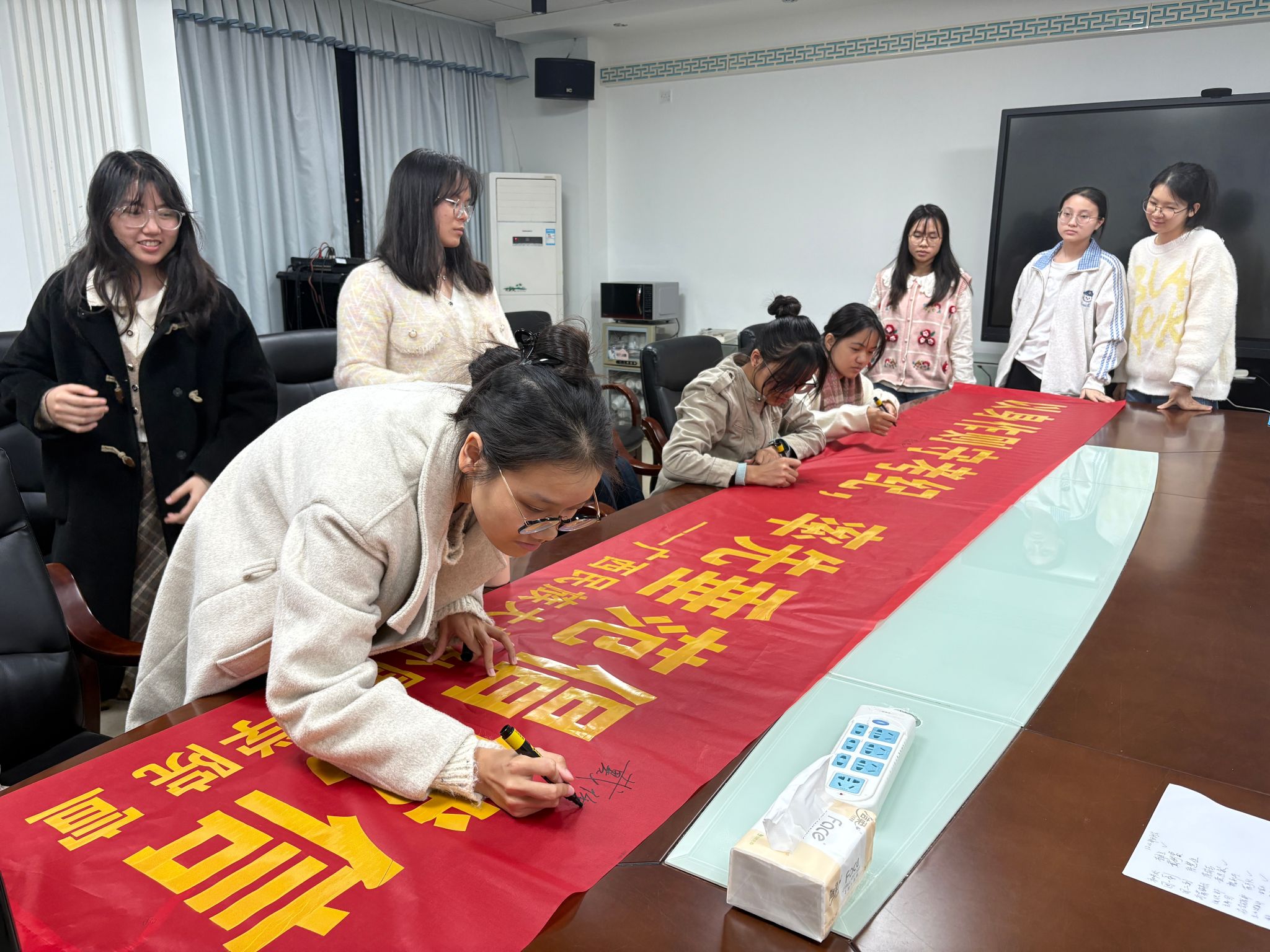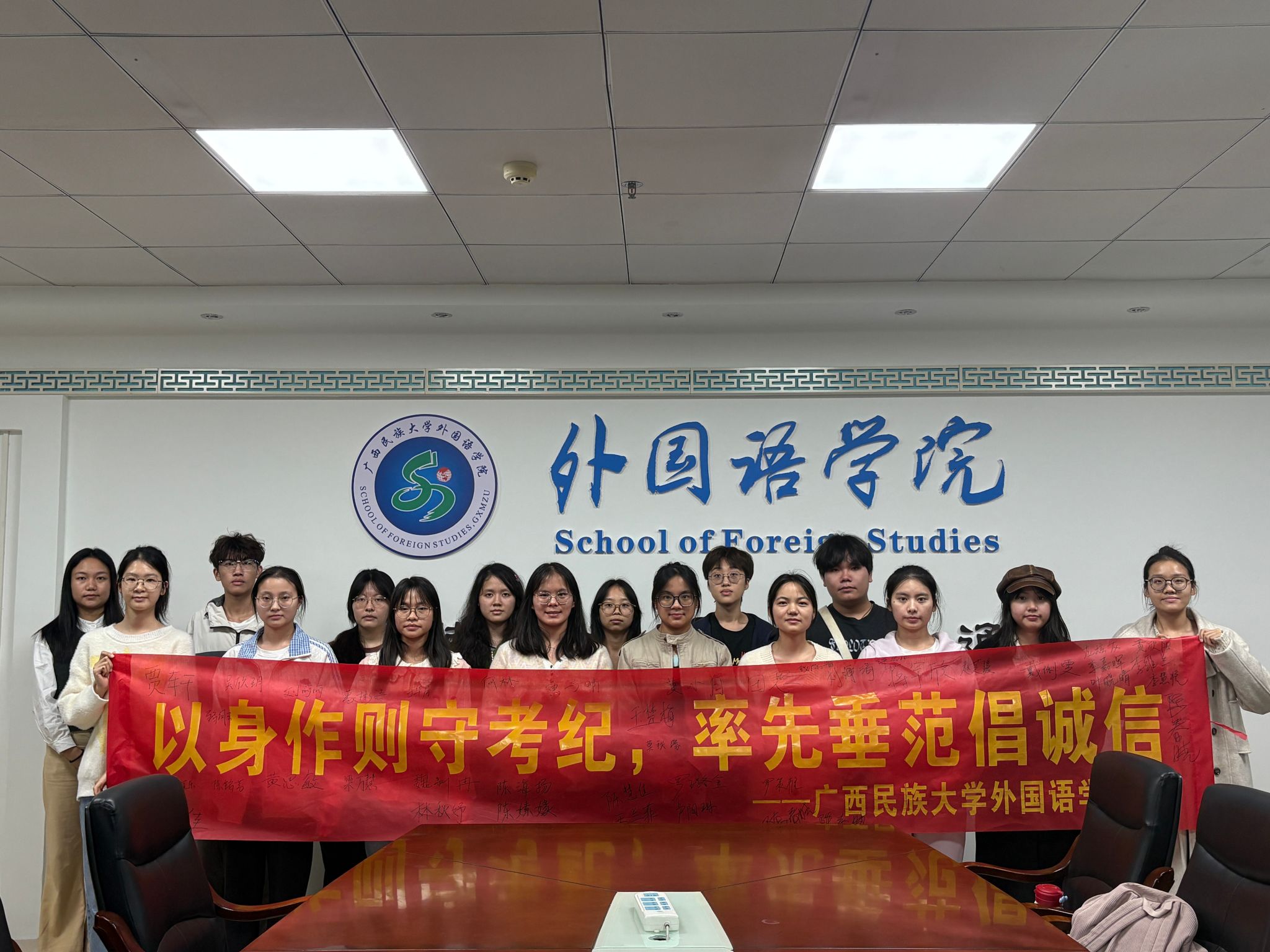 会议伊始,各部门负责人依次汇报近期工作开展情况,全面梳理工作亮点与不足,并就后续工作推进思路展开交流探讨。随后,会议聚焦诚信考试教育环节,围绕“以身作则守考纪,率先垂范倡诚信”主题开展教育引导。吕雅芬老师强调,学生干部要在考试中严格自律、以身作则,坚决严守考试纪律;同时主动发挥先锋模范作用,积极向身边同学宣传诚信考试理念,共同营造公平公正、求真务实的考试氛围。随后,大家在主题横幅上郑重签名,公开承诺将自觉遵守考试纪律,坚决抵制舞弊行为,以实际行动带动全院同学维护良好考风考纪。