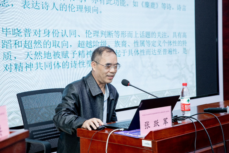 本届年会聚焦于“诗思、诗论、诗艺”,与会专家围绕新时代英语诗歌中的历史、现实与审美表征,诗歌与生命、情感、哲学与其他艺术之间的关系等议题,展开深入研讨。专委会会长张跃军教授代表主办方及联合承办方致开幕辞,并作了题为“伊丽莎白·毕晓普诗歌的共同体书写”的主旨发言。