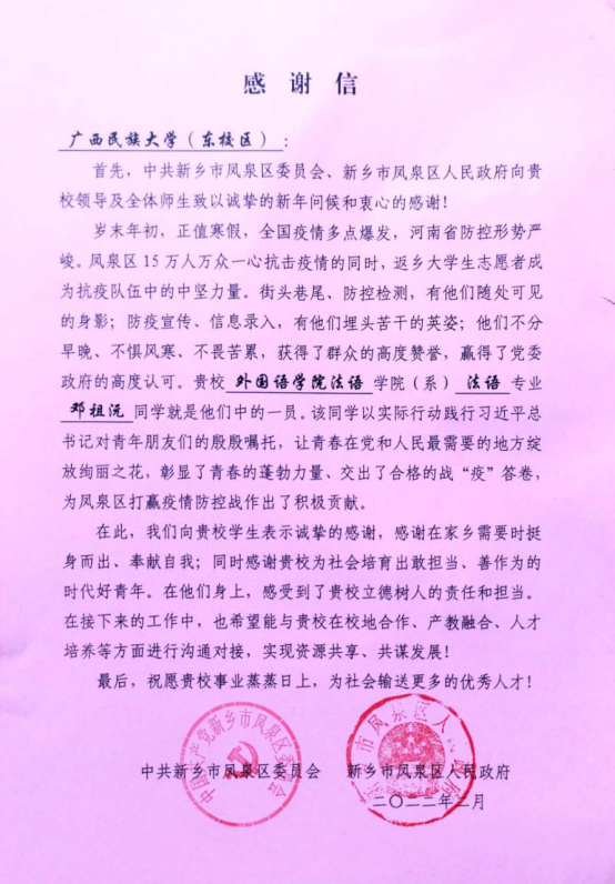 近日,学校收到一封来自中共新乡市凤泉区委员会、新乡市凤泉区人民政府的感谢信。信中对我校必威西汉姆联官网2021级法语专业邓祖沅同学为当地疫情防控工作做出的贡献表示感谢,高度赞扬了我校在立德树人、人才培养等方面所作的努力。